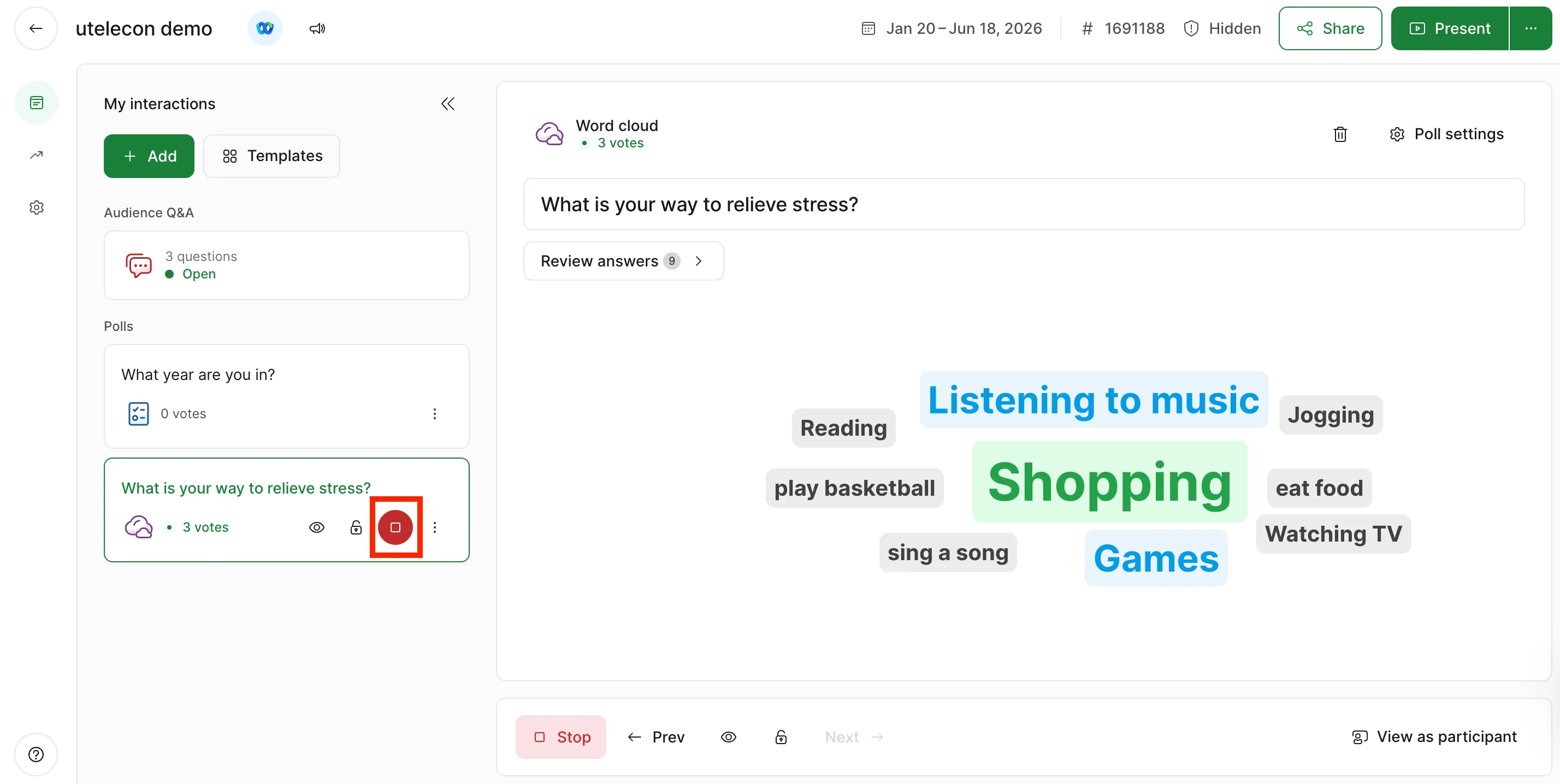 The created polls will be displayed on both the left and right side of the screen. On the left side of the screen, all polls you have created will be displayed. On the right side of the screen, the votes displayed to participants will be shown. To stop displaying polls to participants, click the red button displayed on the left side of the screen.