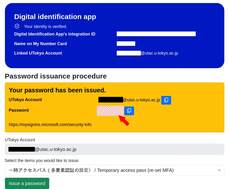 A “Your password has been issued” message will appear. Copy the temporary password provided, then access a page that requires UTokyo Account authentication (e.g., Security info page).