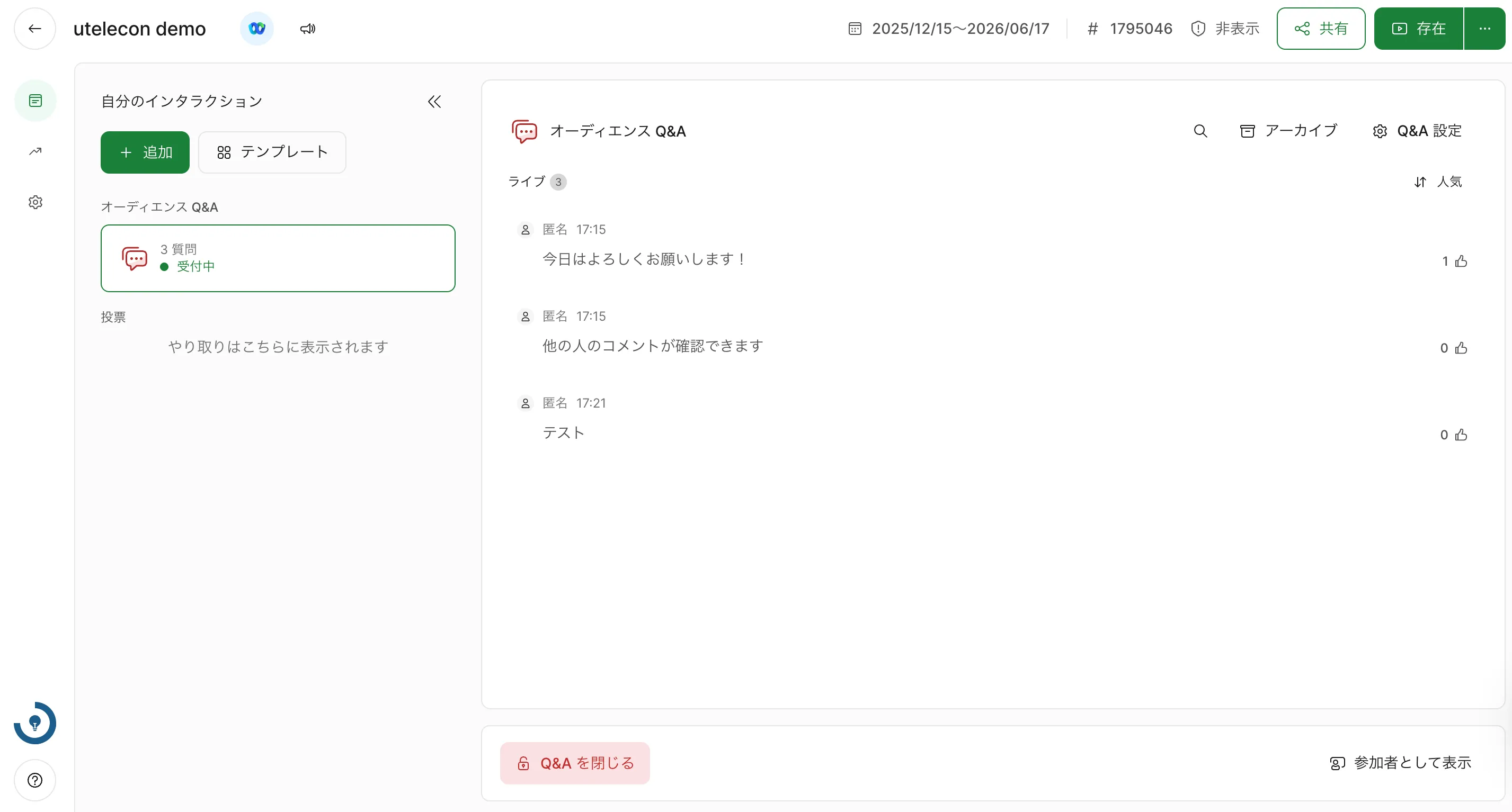 作成した投票は,画面左側と画面右側に表示されます.画面左側にはこれまで作成した全ての投票が表示され,画面右側には参加者に表示されている投票が表示されます.参加者への投票の表示を停止する場合は,画面左側の投票についている赤色のボタンをクリックして下さい.