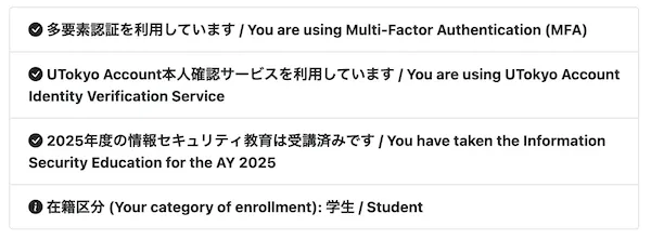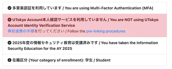連携状況は,UTokyo Account本人確認サービスまたはUTokyo Account利用者情報確認サイト上で確認することができます.