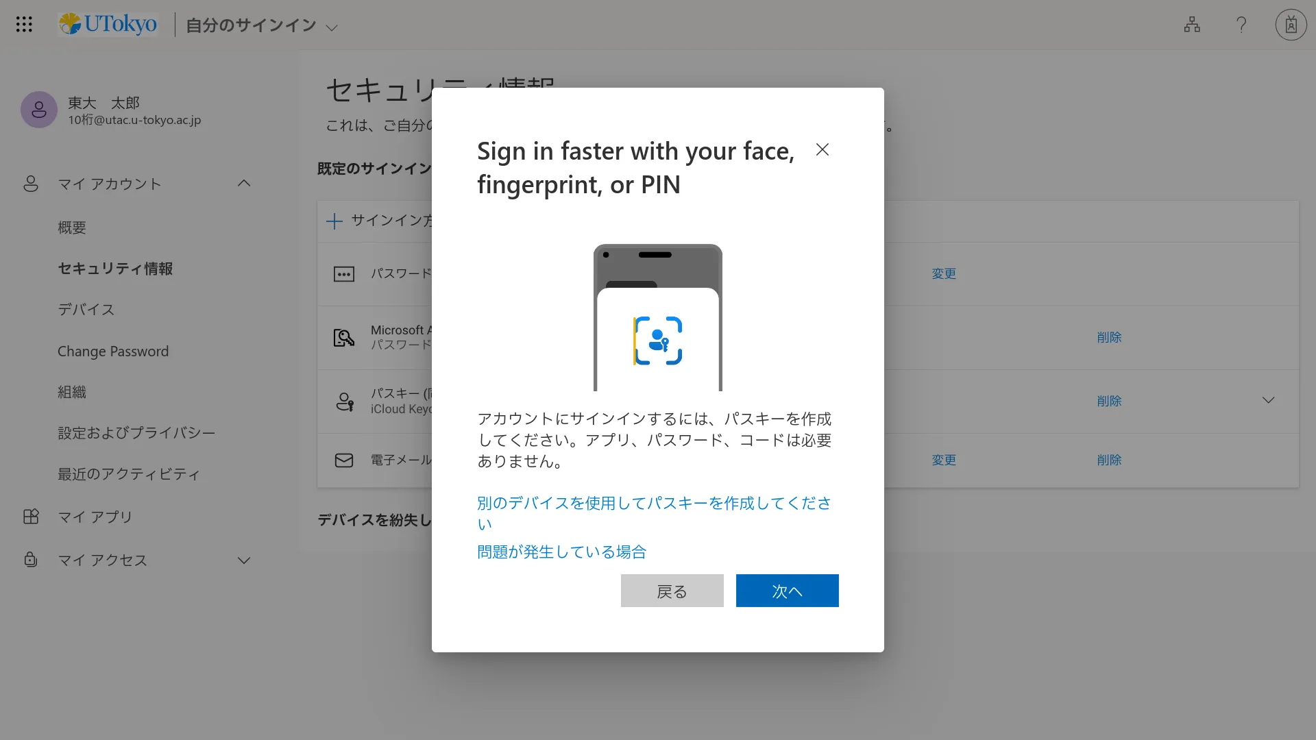 画面の指示に従って,セキュリティキーの設定を完了してください.具体的には,セキュリティキーの接続や,PINあるいは生体認証の設定,セキュリティキーのタップなどが求められます.